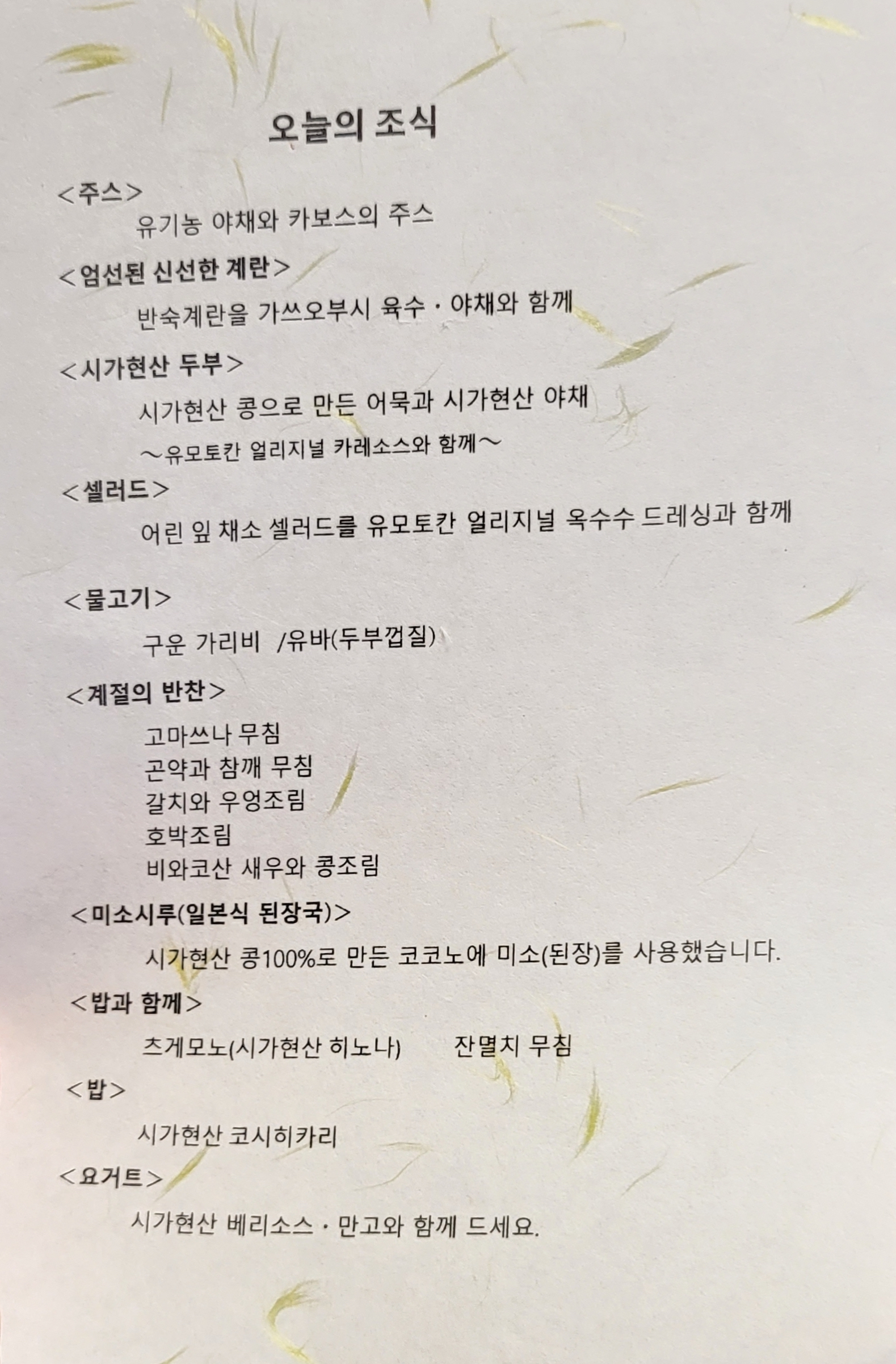 식탁에 예쁜 종이로 메뉴를 프린트해서 올려놓습니다.