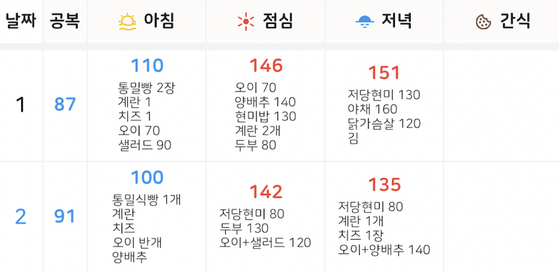 결국 보리밥이 맞는거 같으니 일주일만 더 식단을 해보자! 그렇지만 지금 먹는 밥 양이 너무 적어서 100g으로 늘리고 간식도 추가로 챙겨먹기로 하였습니다.