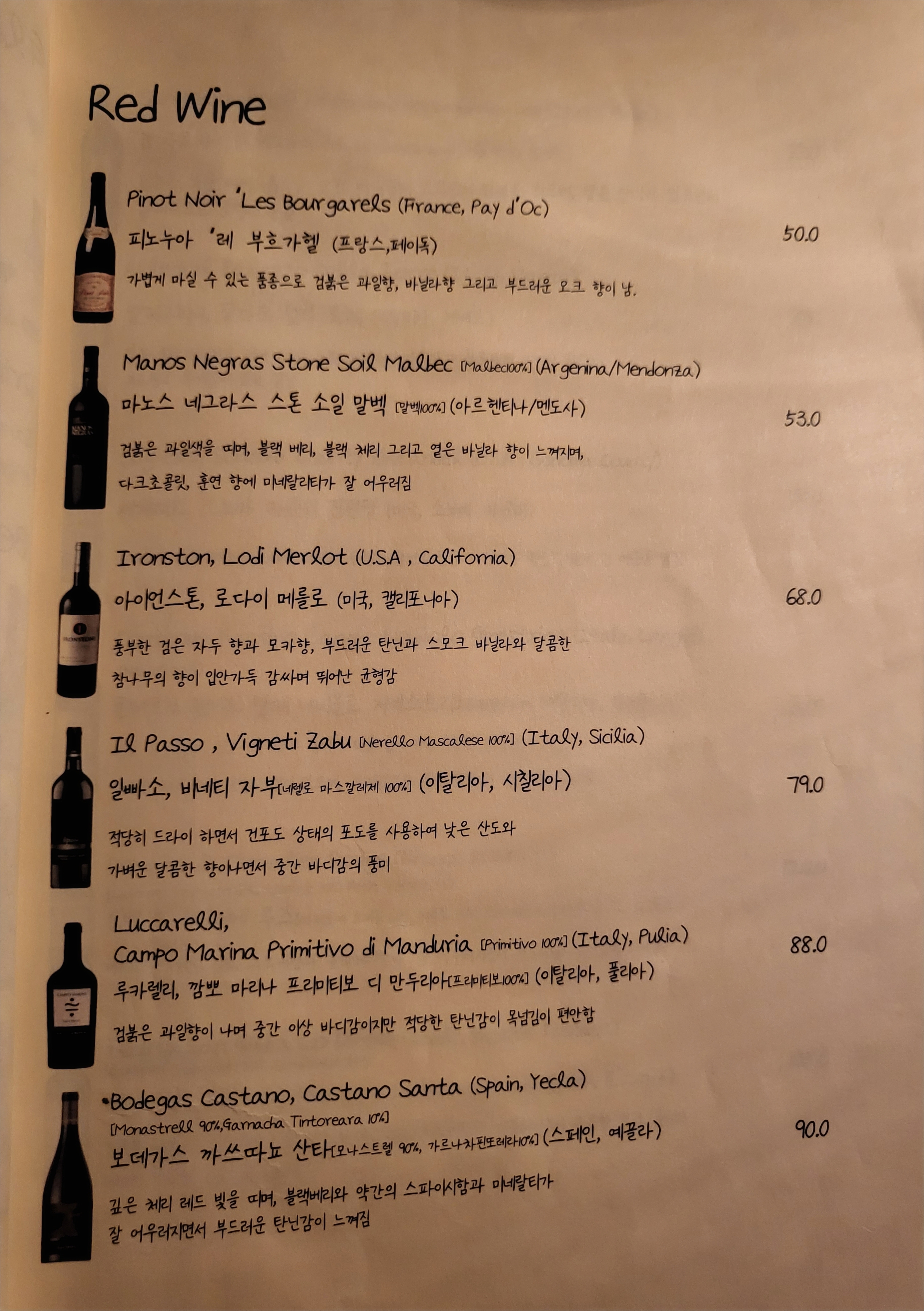 아래 메뉴판은 일부를 찍은것이고, 더 많은 와인이 있으니 참고하세요 😊
