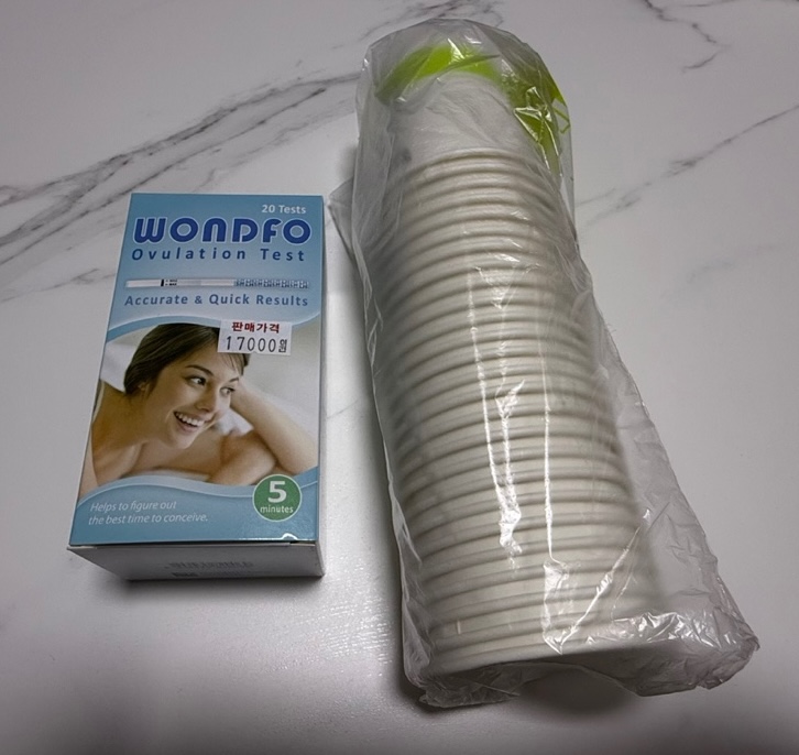 원포 배란테스트기는 소변에 담궈서 확인을 해야하는데 별도의 컵은 들어있지 않으므로 편의점에서 종이컵까지 같이 구매해서 집으로 돌아왔다ㅎㅎ
